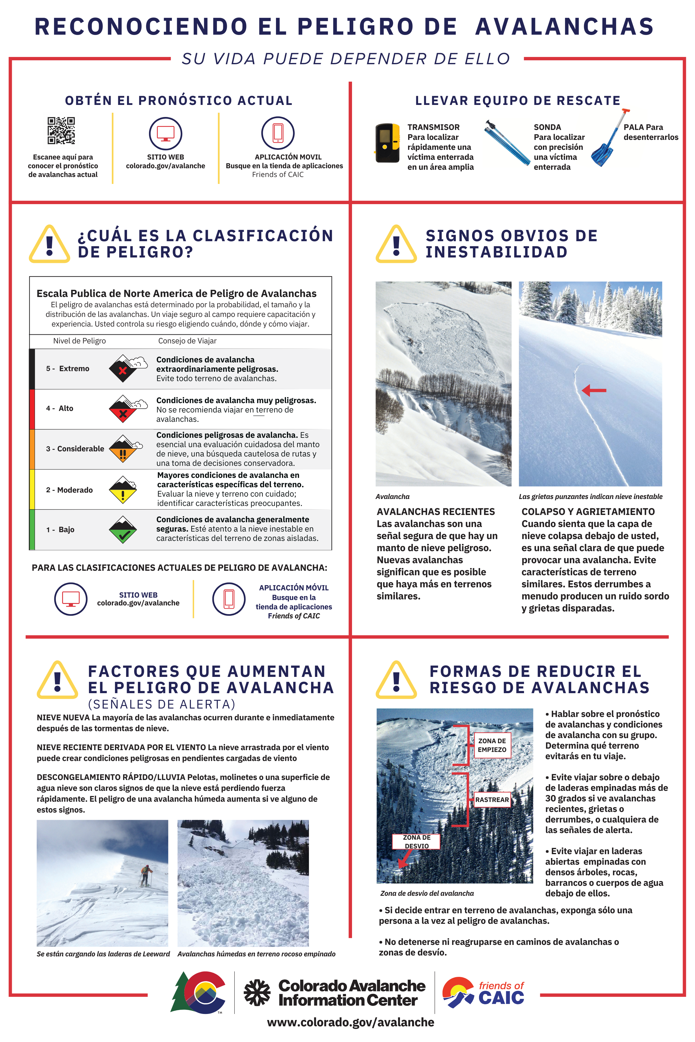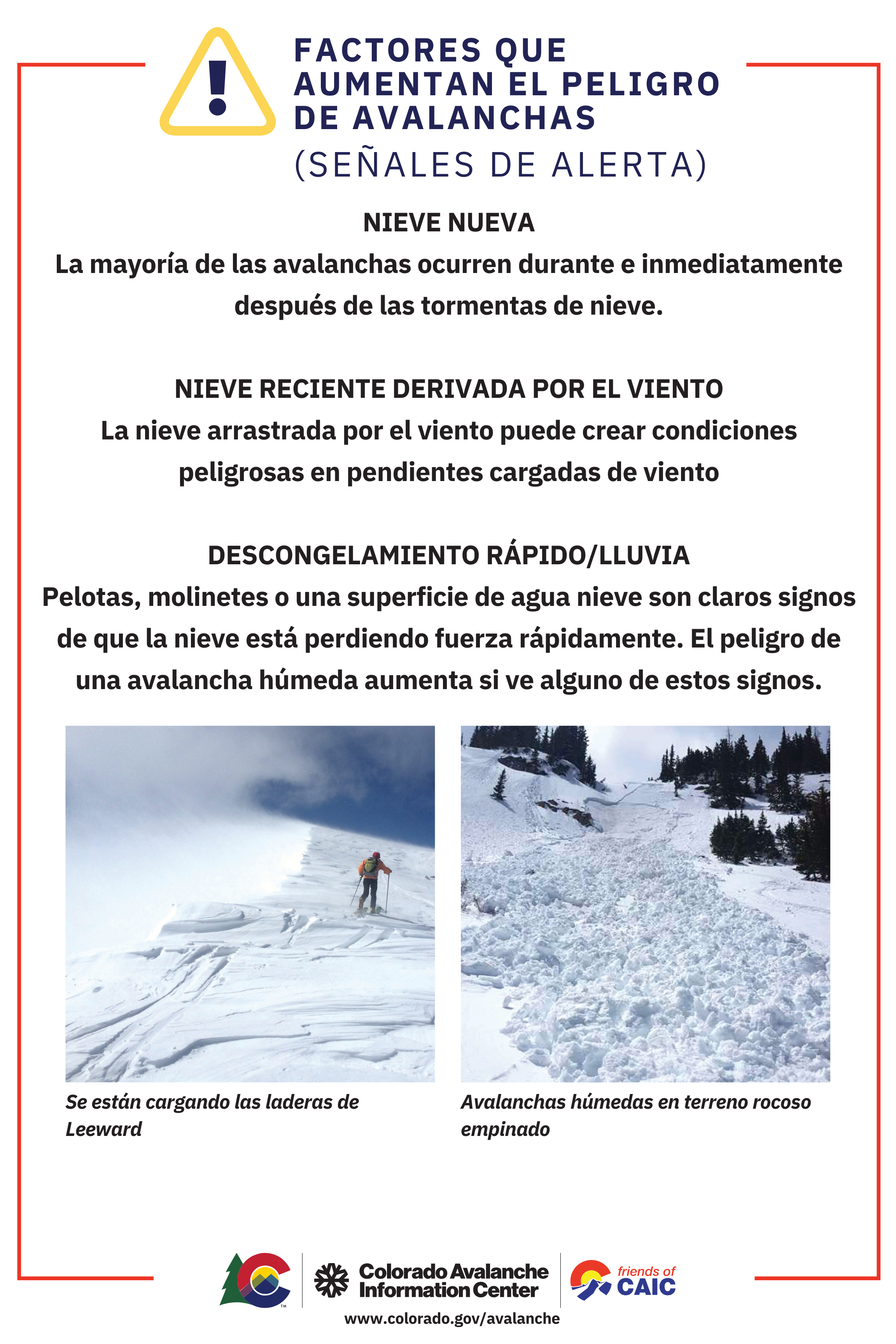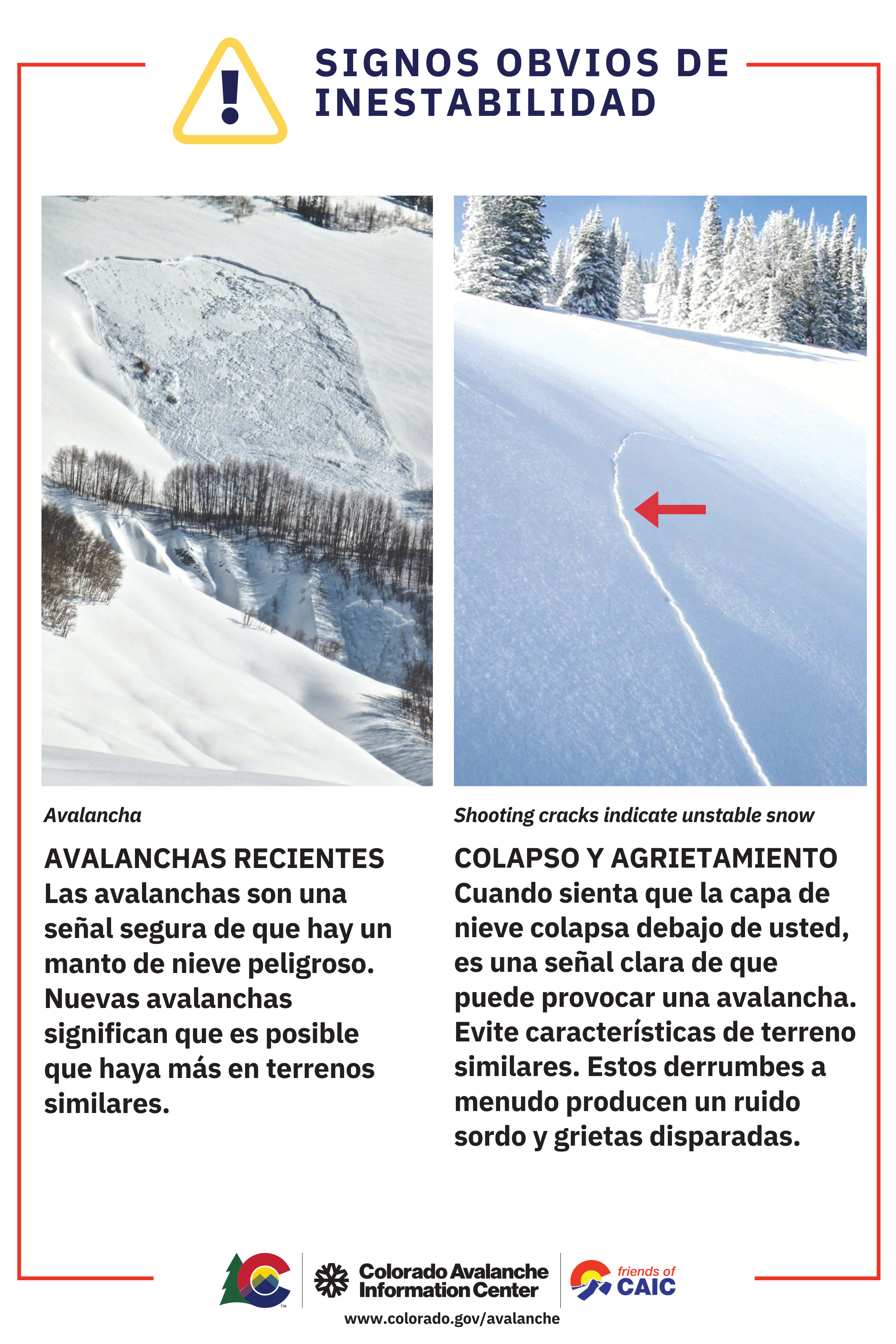 - Los signos de mayor peligro de avalanchas incluyen avalanchas recientes, crujidos en la nieve y derrumbes audibles. Evite viajar sobre o debajo de pendientes similares.