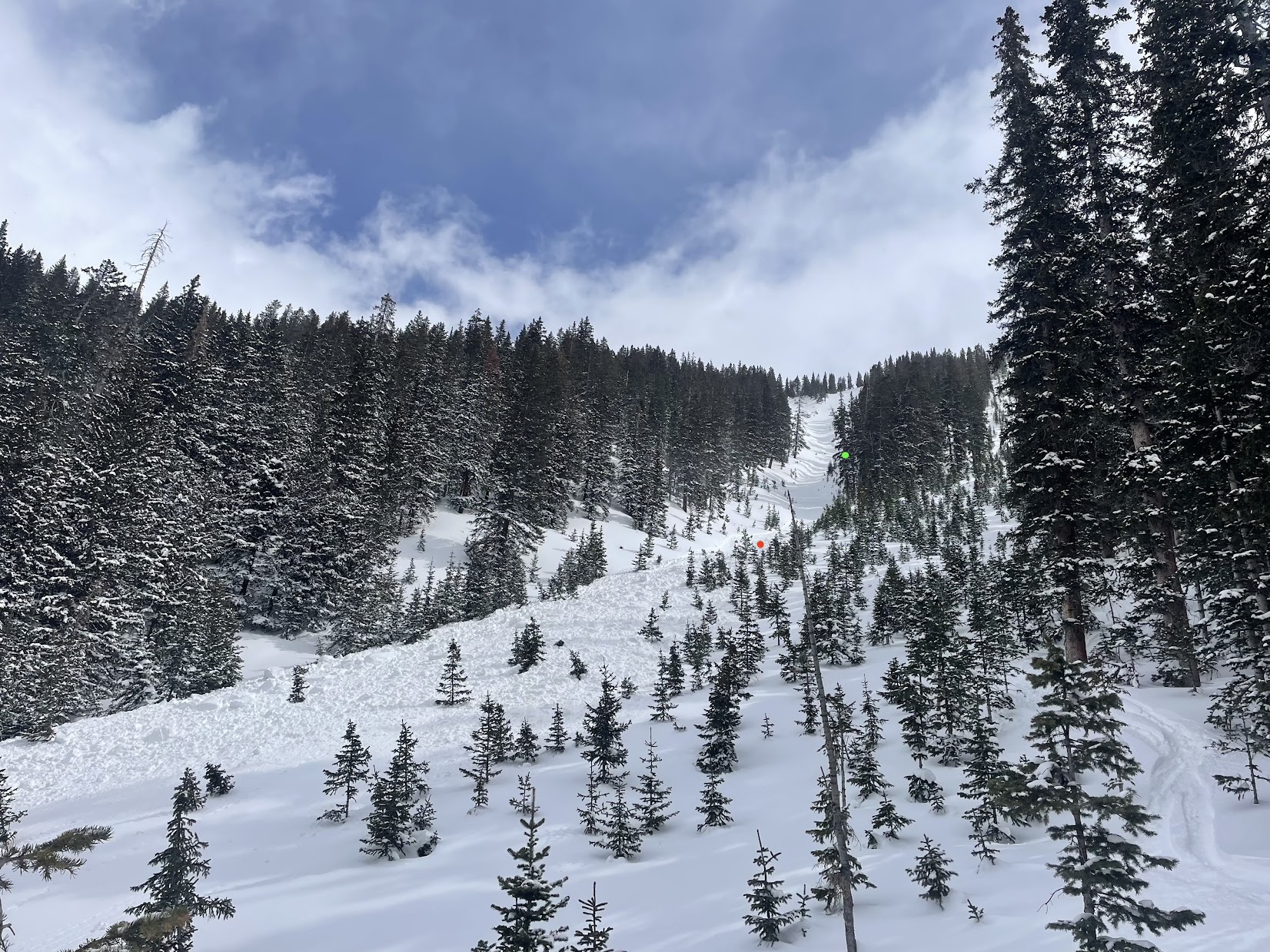 The March 13–15 storm dropped up to 42 inches in the West Elk Mountain. Snow totals tapered to just a few inches in the southern Sawatch Range. Another storm of March 18–19 favored the same areas, bringing up to 24 inches with lighter totals further east. Both storms included strong winds that drifted snow onto easterly-facing slopes. In the past week, 63 avalanches were reported, including two D2s, five D2.5s, and 19 D2s. Of these, 26 were human-triggered. Most avalanche activity occurred on paths that had already slid earlier this season.