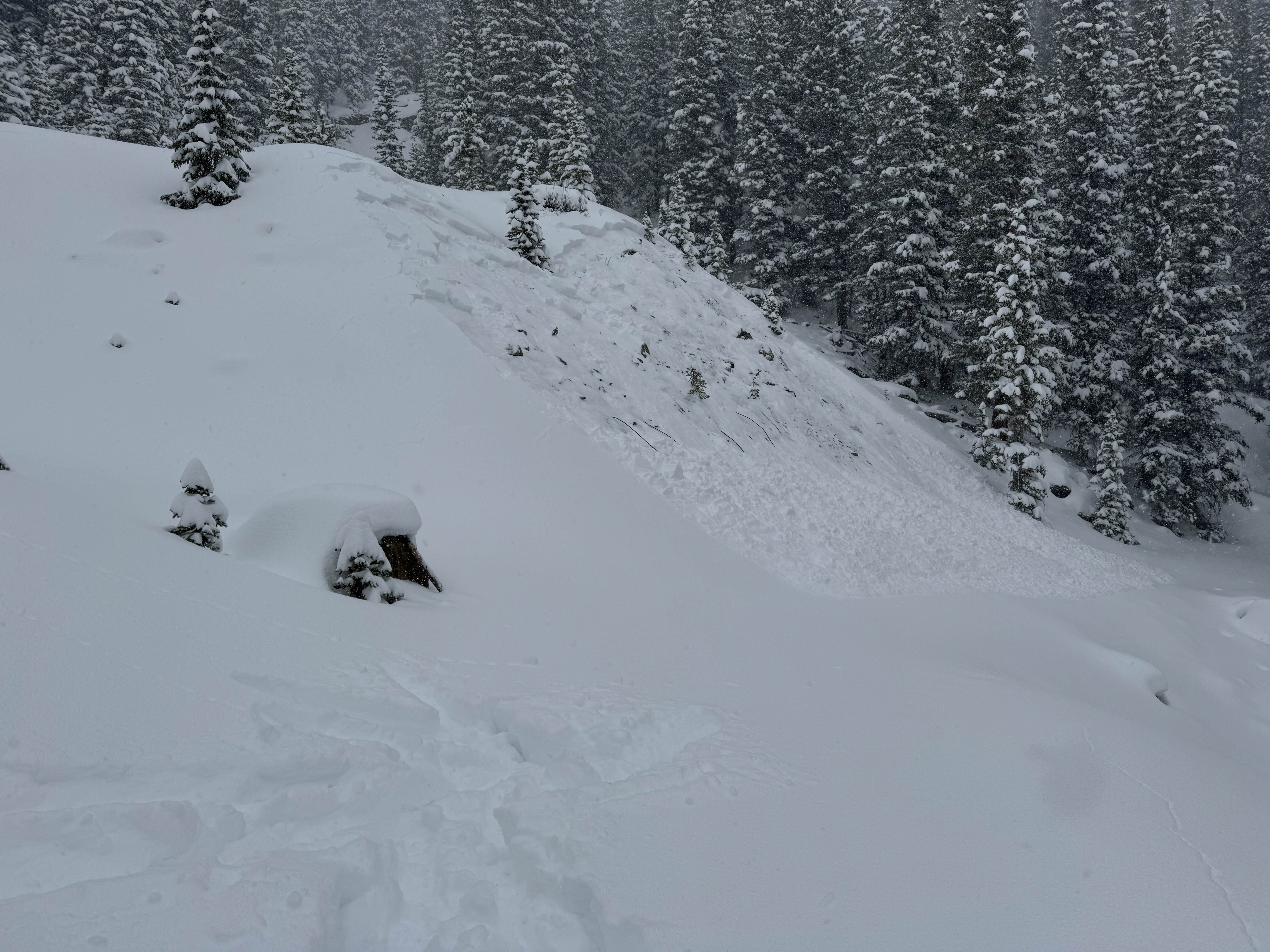 The San Juan Mountains received 12 to 20 inches of snow (1 to 3.5 inches SWE), favoring the western and southern San Juan areas. Many natural avalanches ran during the storm. The heavy snow load is causing avalanches to break on weak layers near the ground. Remotely triggered avalanches and collapsing were widely reported, indicating a reactive Persistent Slab avalanche problem.
